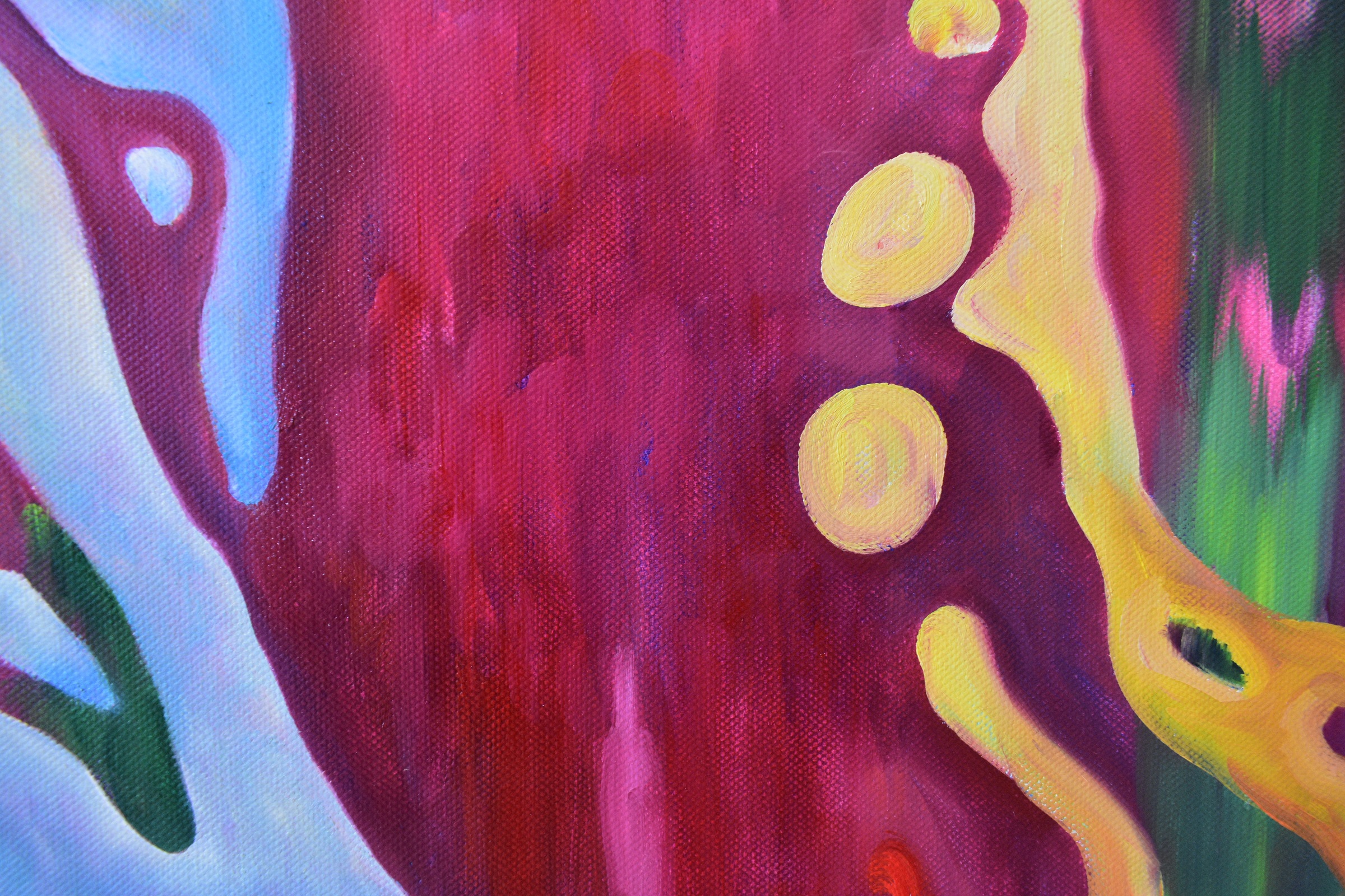 Поющие фонтаны – магическое представление, построенное на взаимодействии света, музыки и потоков воды. Струи воды превращаются в живых танцоров, они взлетают высоко вверх в мажорных аккордах и склоняют голову под минорные. Сияние цветных капель и переливы пенных форм создают волшебные костюмы для этих талантливых артистов. Музыкальные фонтаны встречаются по всему миру, неизменно притягивают туристов и оставляют яркий след в воспоминаниях. Это истинное чудо водной инженерии. Картина написана в технике многослойной живописи с лессировками тонкими слоями масляной краски, что позволяет создать трехмерный объем и свечение нижних слоев краски через прозрачные верхние слои. Работа над картиной проходила в течение нескольких недель, чтобы добиться полного высыхания и укрепления каждого предыдущего слоя.
