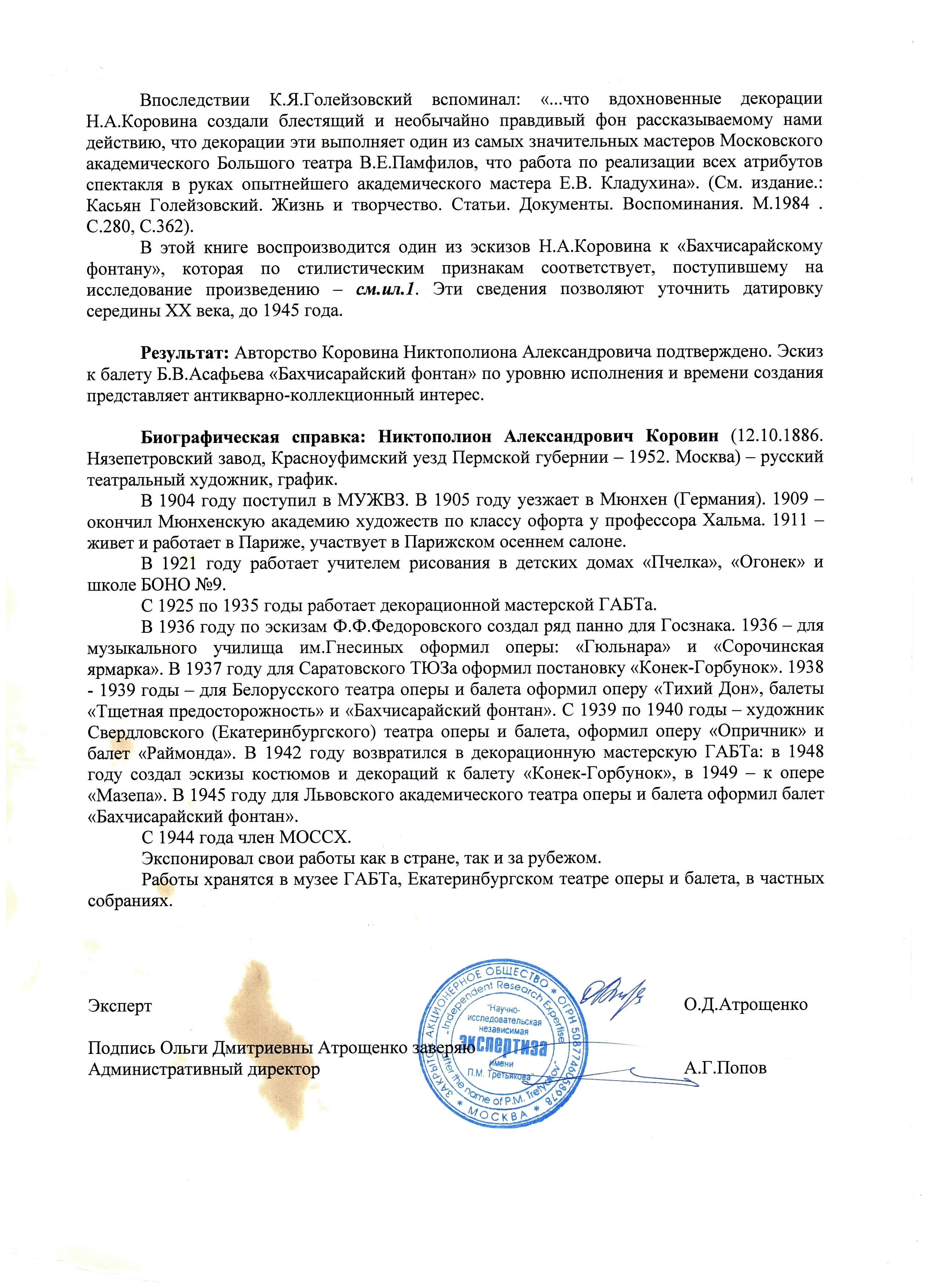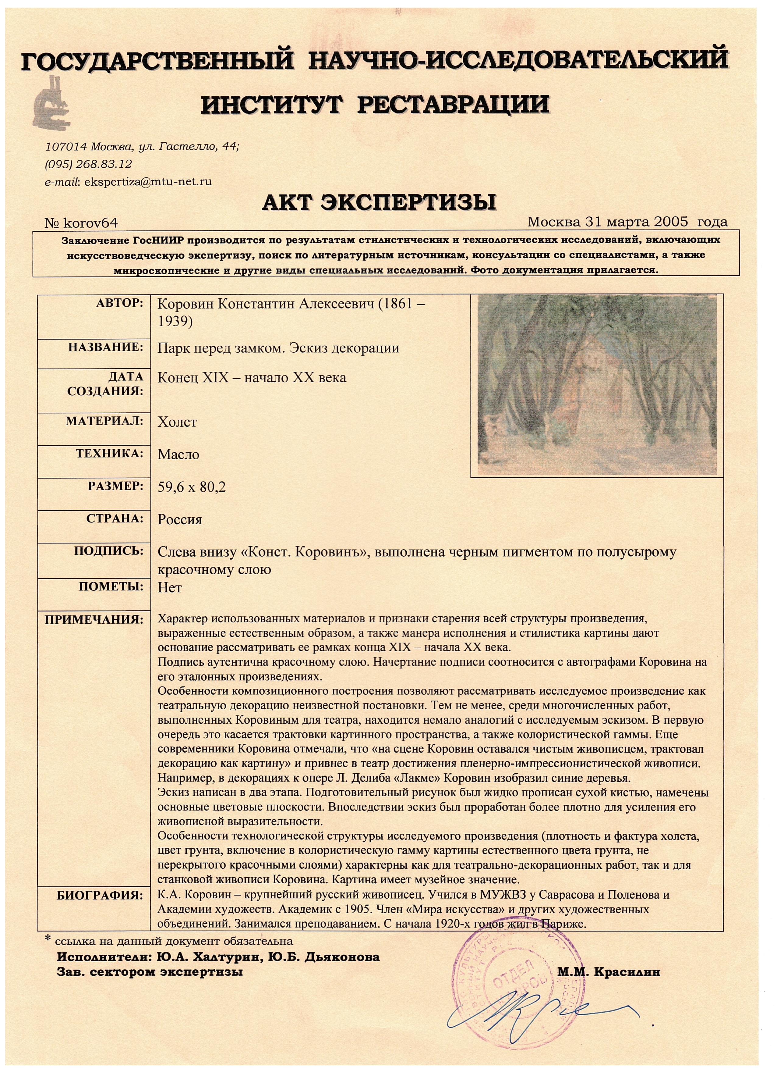 Экспертиза: НИНЭ им. П.М. Третьякова; ГТГ; Art Consulting; ГосНИИР
