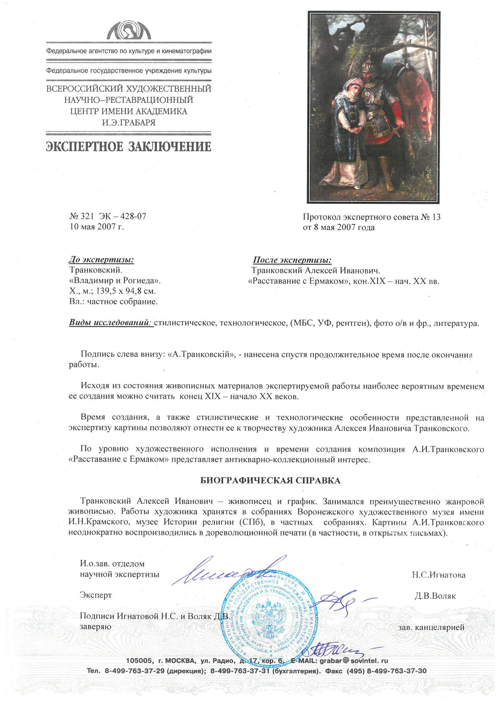 Экспертное заключение: ВХНРЦ им. ак. И. Э. Грабаря.